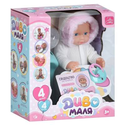 У наборі є соска, пляшечка, горщик та свідоцтво народження — усе необхідне для догляду за малюком. Лялька вдягнена у теплий комбінезон з пухнастим капюшоном, який додає їй милого вигляду та створює затишну атмосферу гри.