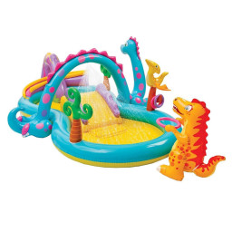 Дитячий ігровий центр Intex 57135 Планета динозаврів - чудово виконаний, барвистий аквапарк, який викличе самі захоплюючі емоції і у хлопчика, і у дівчинки. Модель відрізняється чудовою якістю виготовлення з високоміцного, нетоксичного матеріалу, який не має в складі небезпечних і шкідливих компонентів. Центр об'єднав в собі комплекс і атракціон - все необхідне для юних шукачів пригод. Продумана, оптимальна глибина, м'яке надувне дно і комфортабельні бортики дозволяють використовувати басейн з динозаврами навіть для самих маленьких діток, не турбуючись про їхню безпеку. Дитячий багатофункціональний центр здатний виконувати кілька завдань - в теплу пору року його зручно використовувати для купання та ігор з водою, а в холодний сезон в якості ігрової зони, наповнивши вміст сухими різнокольоровими кульками. Зручні високі борти не дозволяють виливатися воді, поки малюк плюскається і влаштовує водяні гонки. Ігровий центр здатний витримувати до 81 кг, і доповнений надувними м'ячиками.