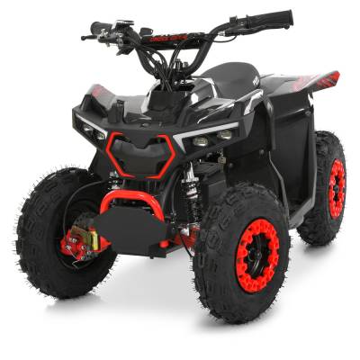 Квадроцикл оборудован большими надувными колесами, обеспечивающими надежное сцепление с поверхностью. Передние и задние амортизаторы с возможностью регулировки жесткости эффективно поглощают неровности. Дисковые тормоза спереди и сзади обеспечивают контролируемое и безопасное торможение, а цепная передача отвечает за передачу мощности.